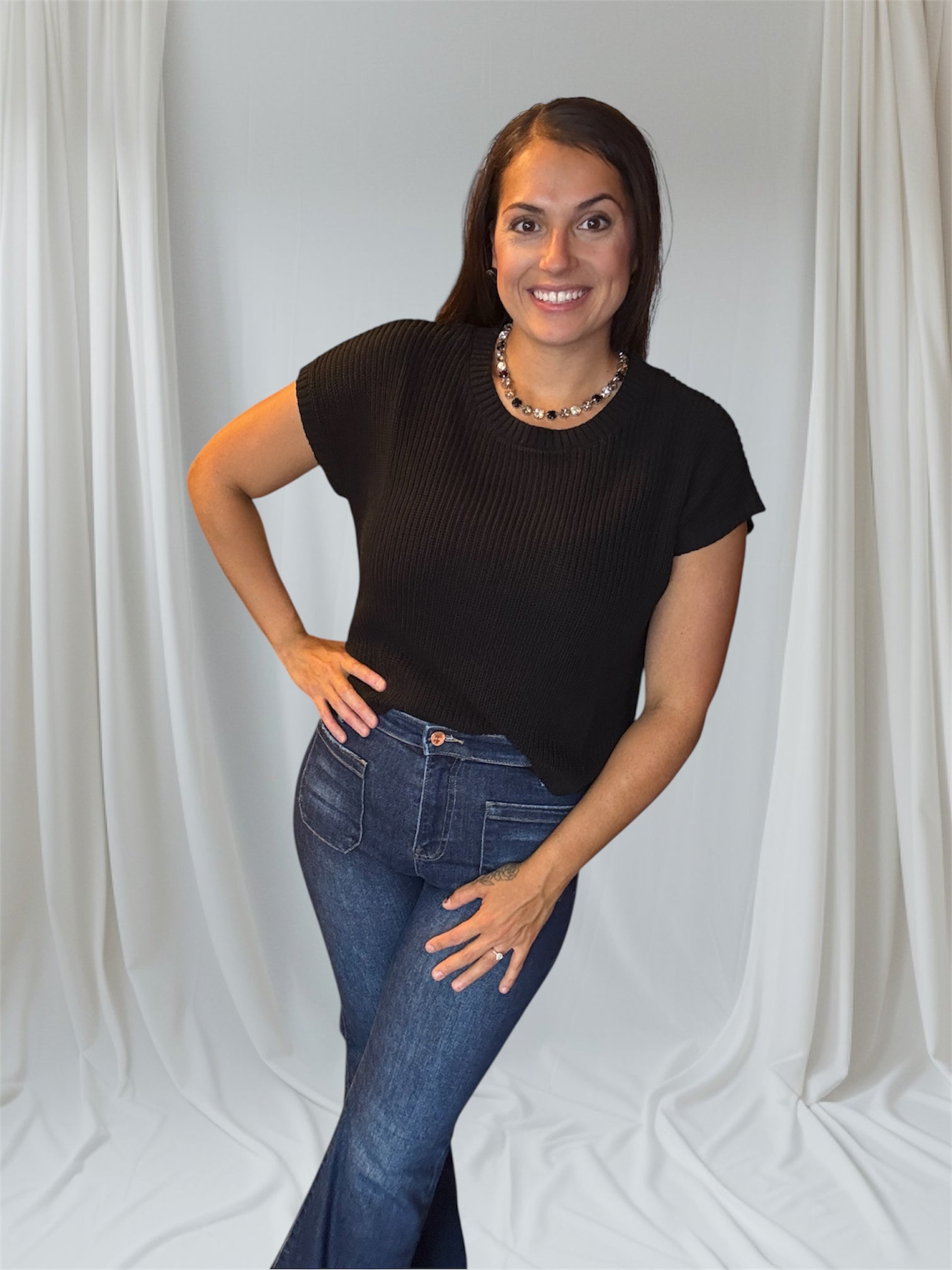 Effortless style meets cozy comfort in this black knit sweater tee — your new go-to for transitioning from daytime errands to evening plans. With its soft ribbed texture, relaxed fit, and versatile silhouette, this piece gives you understated elegance with every wear.